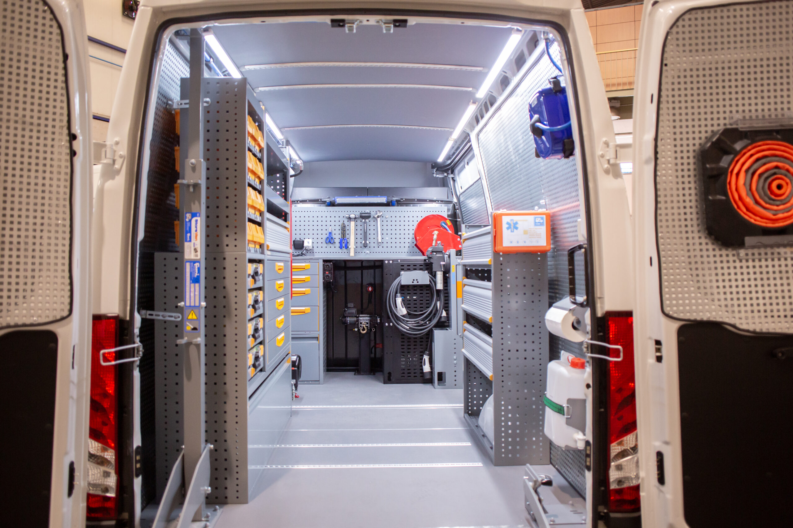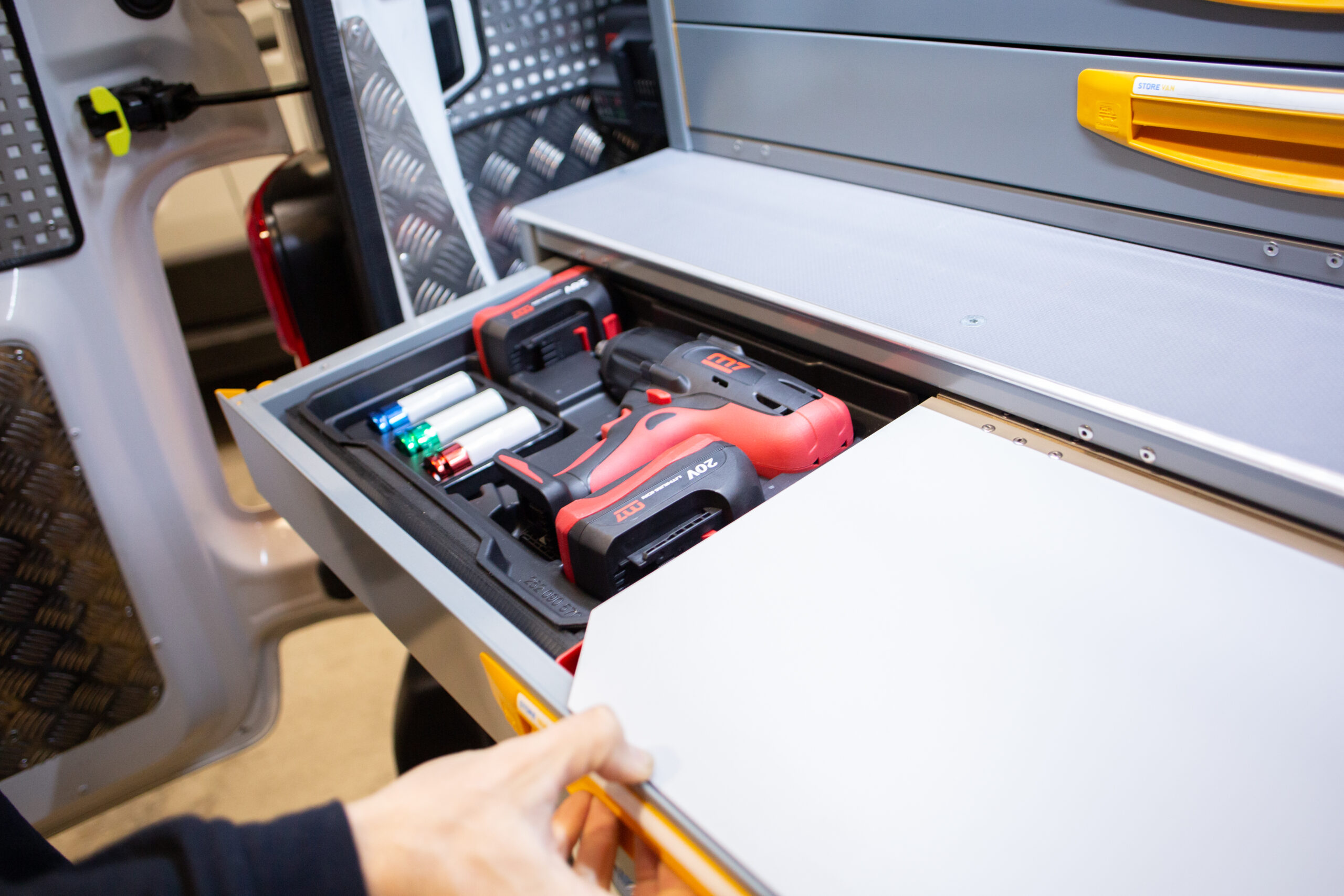 Estas soluciones se integran perfectamente con otros sistemas del equipamiento interior de la furgoneta como estanterías, maletines extraíbles, bandejas, bancos de trabajo y plataformas correderas. Esto permite crear un espacio totalmente personalizado, con posibilidad de crecimiento o modificación futura sin tener que cambiar toda la instalación ya realizada.