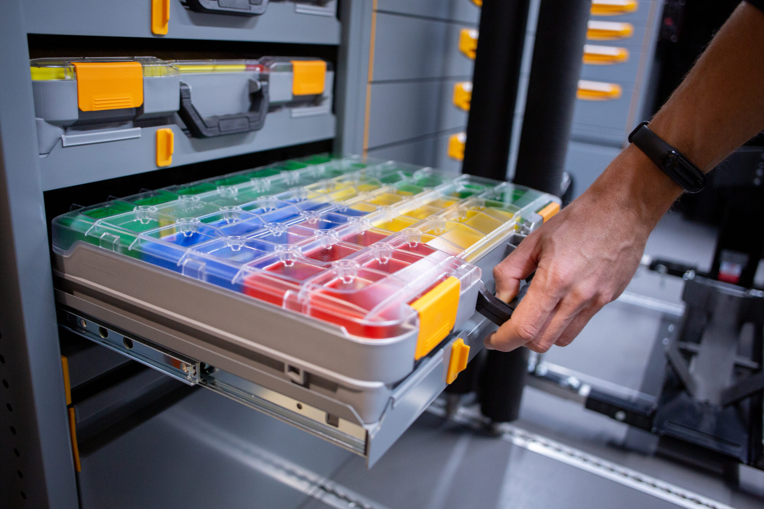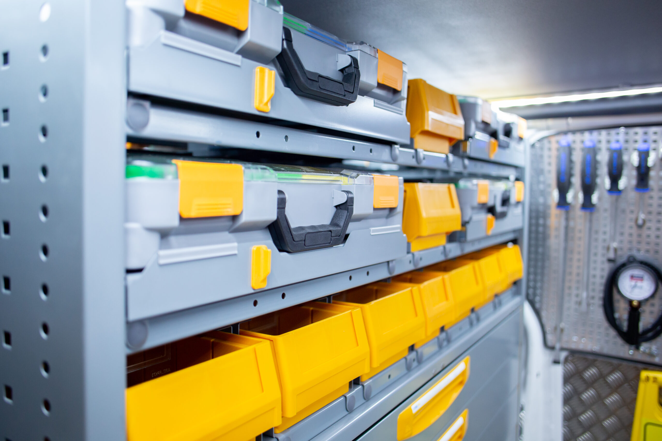 Todos los componentes que las forman están pensados para resistir las exigencias del trabajo diario: manillas ergonómicas, guías con resortes galvanizados, superficies lavables, sistemas de bloqueo y estructuras resistentes a la corrosión. Además, nuestras soluciones cumplen con las normativas de seguridad en carretera, evitando que los cajones se abran durante la conducción o que las herramientas se desplacen dentro del vehículo.